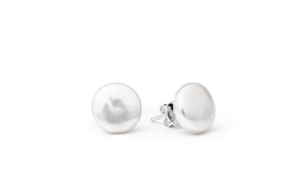 Stilistiske hvide perleørestikker i sølv med 14-15 mm knapformede naturlige ferskvandsperler.